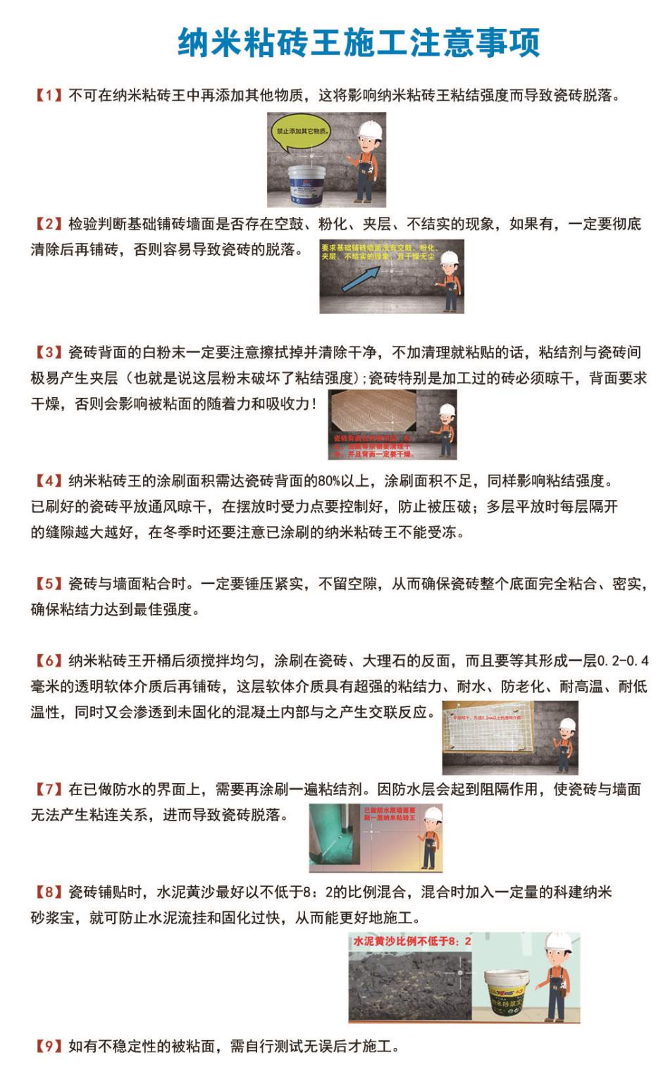 5)應避免納米粘磚王沾掛在待粘物正面,導致難以清洗;