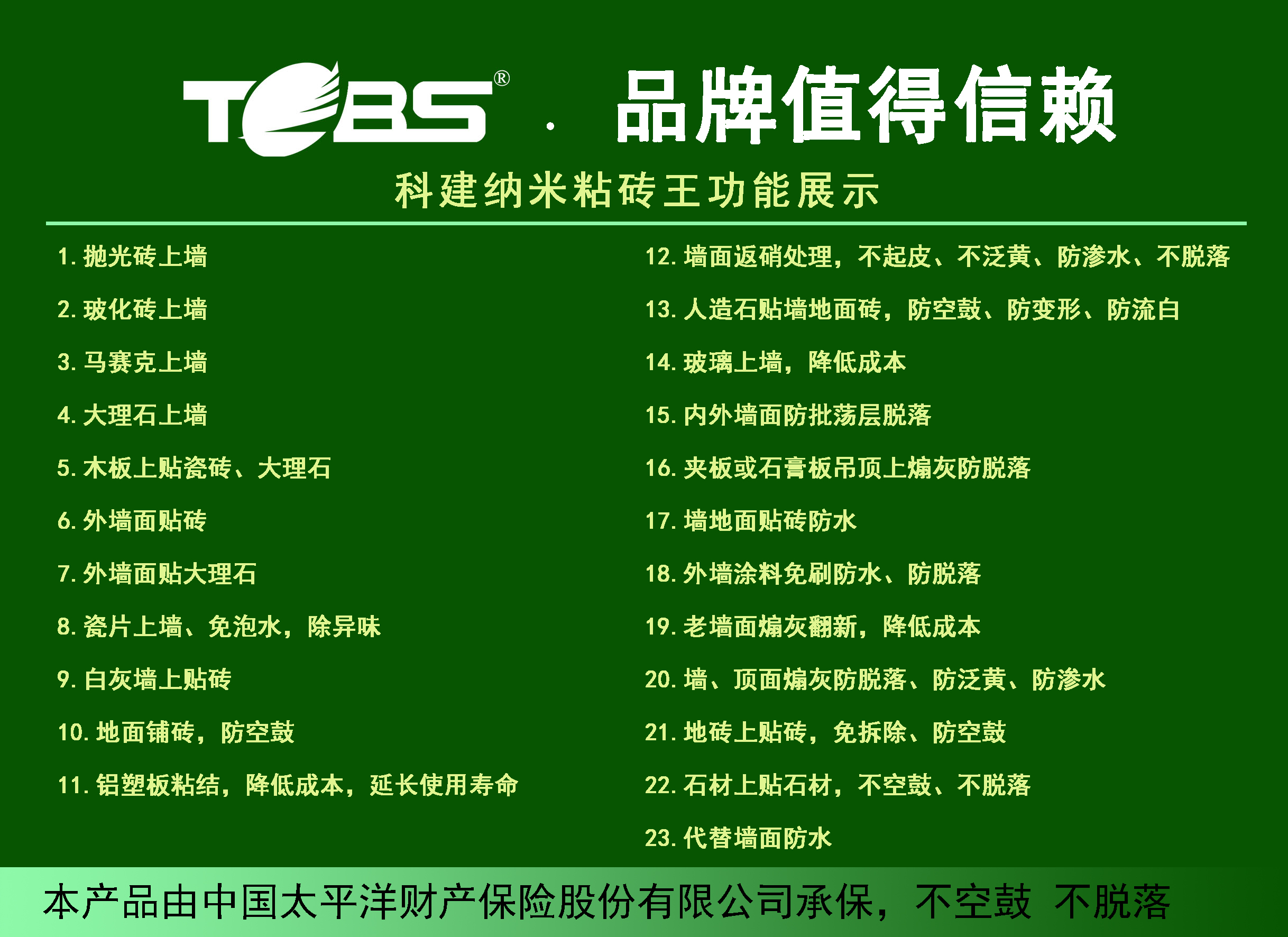 TOP BEST納米粘磚王是一種單組份、水性、無毒、環保型的粘結劑,主要使用于各種瓷磚、仿古磚、馬賽克、大理石、人造石材、天然石材鋪設,是瓷磚脫落、空鼓的克星;同時又有施工方便、粘結性能強、耐水、耐高低溫、耐老化等各種優秀性能,是各種瓷磚、仿古磚、馬賽克、大理石、人造石材、天然石材鋪設的理想的粘結產品。多年來,瓷磚空鼓、滲水、脫落現象一直是建筑行業的一大頑癥,TOP BEST納米粘磚王解決了建筑行業瓷磚、大理石上墻后空鼓、脫落的難題。