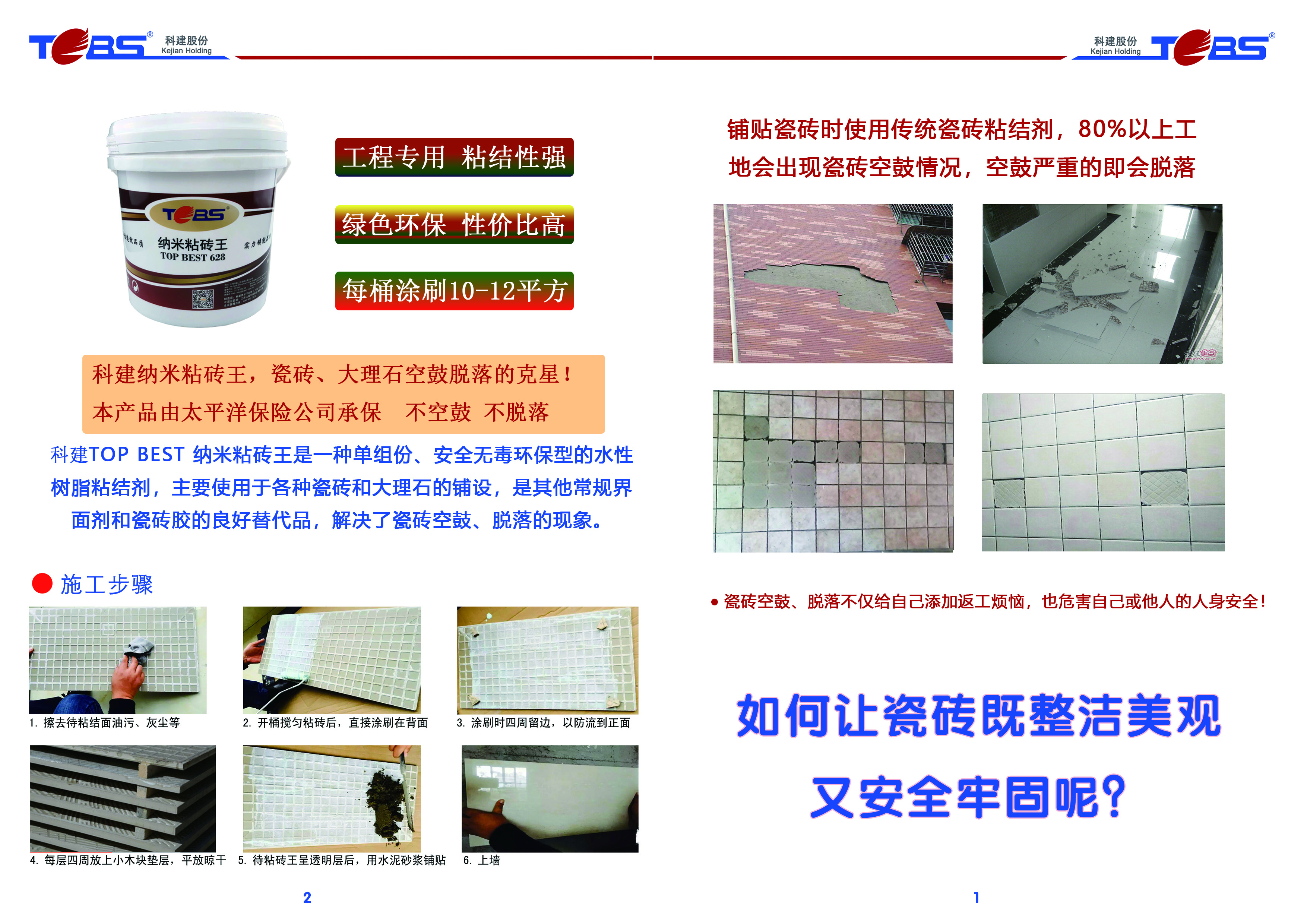 2)施工:將粘磚王攪拌均勻后,直接涂刷在瓷磚、馬賽克、大理石、人造石材的背面(磚四周可留2mm左右,以防流到正面),等其表面呈透明狀,用普通水泥砂漿鋪貼,即可。被貼的墻面也建議涂刷一遍TOP BEST納米粘磚王,這樣粘結(jié)力更強(qiáng),防水效果更好,絕對不空鼓、不脫落。