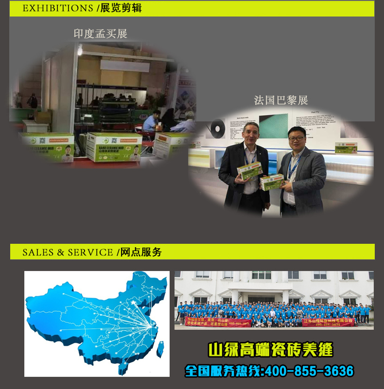 山綠公司旗下代理商已遍布全國(guó)一百多個(gè)省市地區(qū),施工人員均經(jīng)過(guò)公司專業(yè)技術(shù)培訓(xùn),隨著“山綠”品牌市場(chǎng)占有率越來(lái)越大,公司敬請(qǐng)廣大客戶可從以下幾點(diǎn)認(rèn)準(zhǔn)“山綠”正品,以保障自身權(quán)益:施工人員穿有“山綠”字樣的工作服;材料包裝上印有“山綠”LOGO;與工作人員簽訂的“山綠”品牌美縫協(xié)議。
